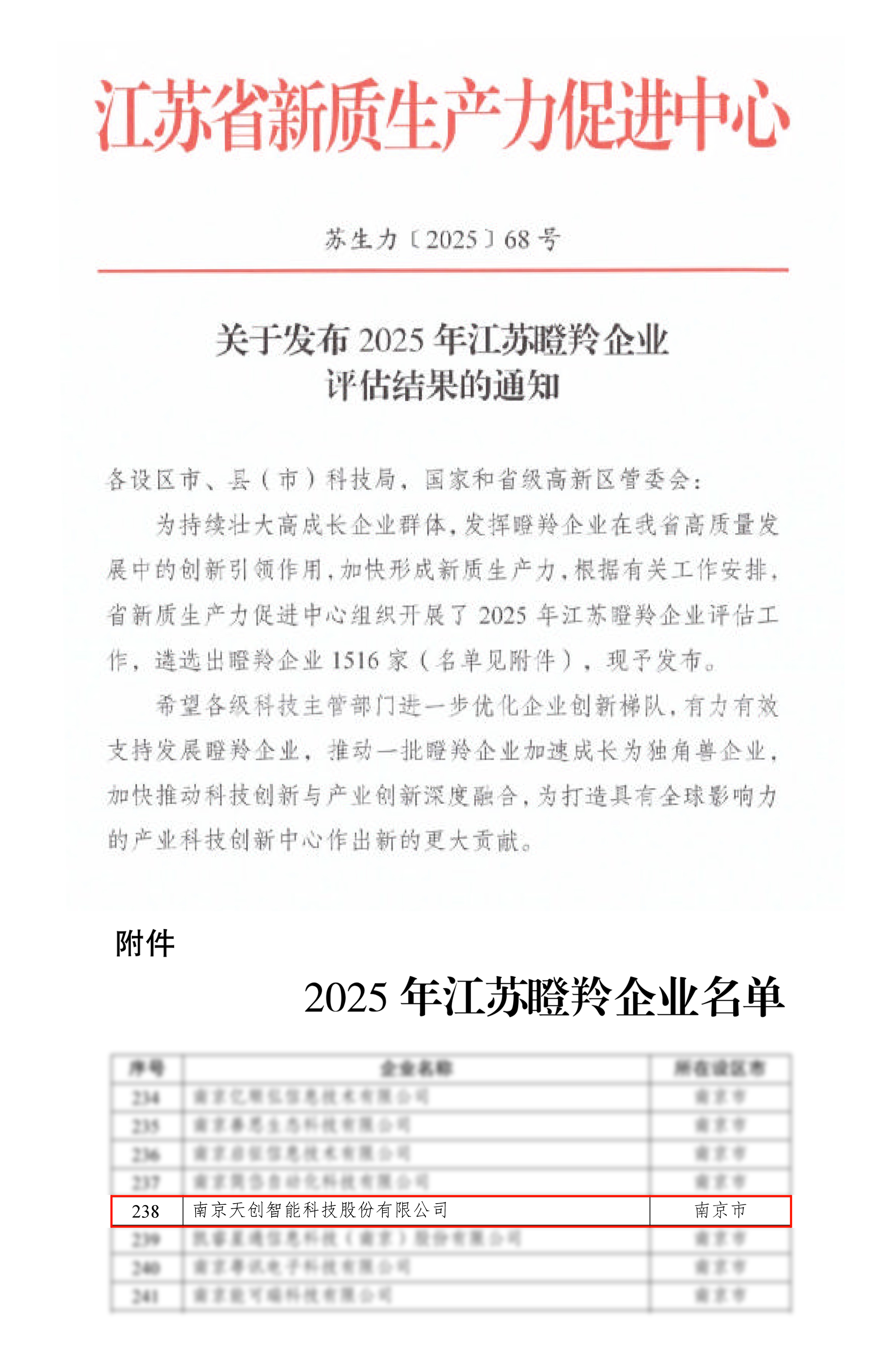 近日,江苏省新质生产力促进中心发布关于2025年江苏瞪羚企业评估结果,天创机器人凭借卓越的创新能力与高成长性,荣耀登榜,获评“江苏瞪羚企业”称号!